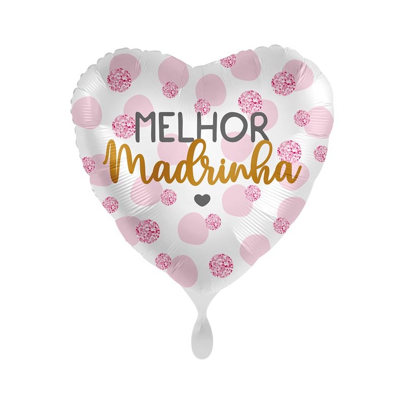 Balão foil no formato de coração a dizer "Melhor Madrinha", com motivos de manchas em tons de rosa. Pode ser cheio com hélio ou com ar. Tamanho: 17" - 43cm