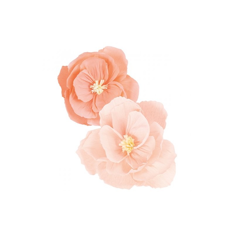 Embalagem com 2 flores de papel crepe, uma em rosa pastel e outra no tom pêssego. Tamanhos: 40 a 50cm