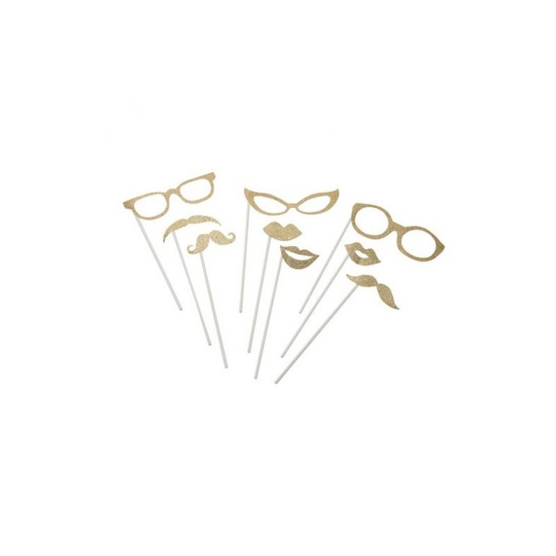 Embalagem com 9 aderços diferentes, para fotos "Photo booth" em tom dourado com gliter.