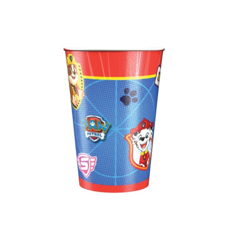 Embalagem com oito copos de papel do tema da Patrulha Pata. O copo é nas cores principais da Patrulha Pata e é decorado com alguns motivos desta equipa canina. Capacidade 250ml.