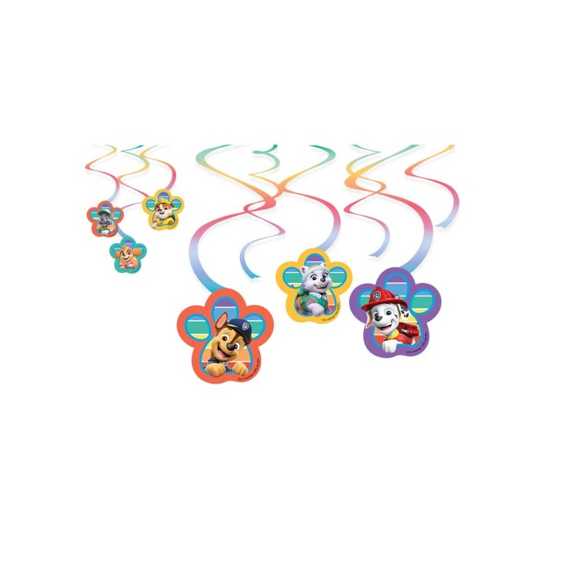Embalagem com seis decorações de pendurar no teto do tema da Patrulha Pata. As decorações são em espiral. Três das seis decorações têm imagens relacionados com a Patrulha Pata. Cada lado da decoração tem uma personagem diferente. As decorações com as imagens medem 60 cm. As restantes 30 cm.