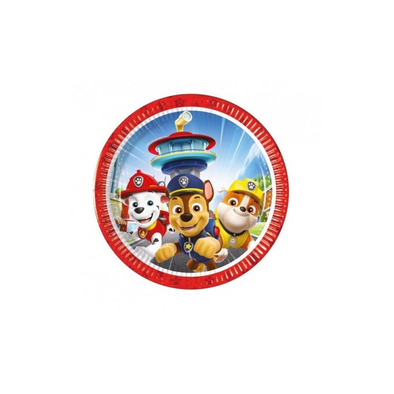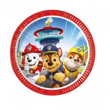 Embalagem com 8 pratos no formato redondo, pequenos, de papel, com as personagens "Chase", "Marshall" e "Rubble" da Patrulha Pata. Tamanho: 18cm
