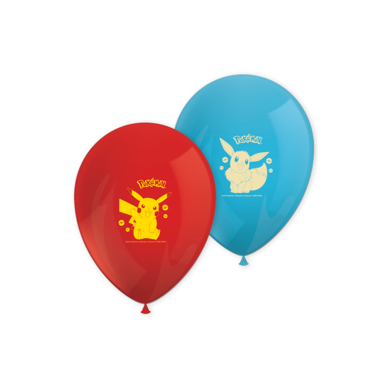Embalagem com 8 balões de látex, com as personagens do pokémon, em duas cores: vermelho e azul.