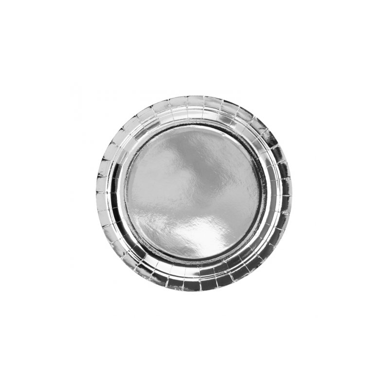 Embalagem com 6 pratos redondos de papel na cor prata. Aproximadamente 23cm