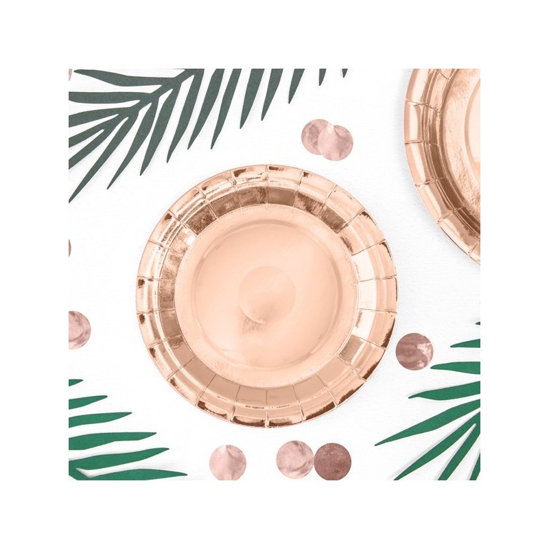 Embalagem com 6 pratos de papel redondos em rose gold. Aproximadamente 18cm