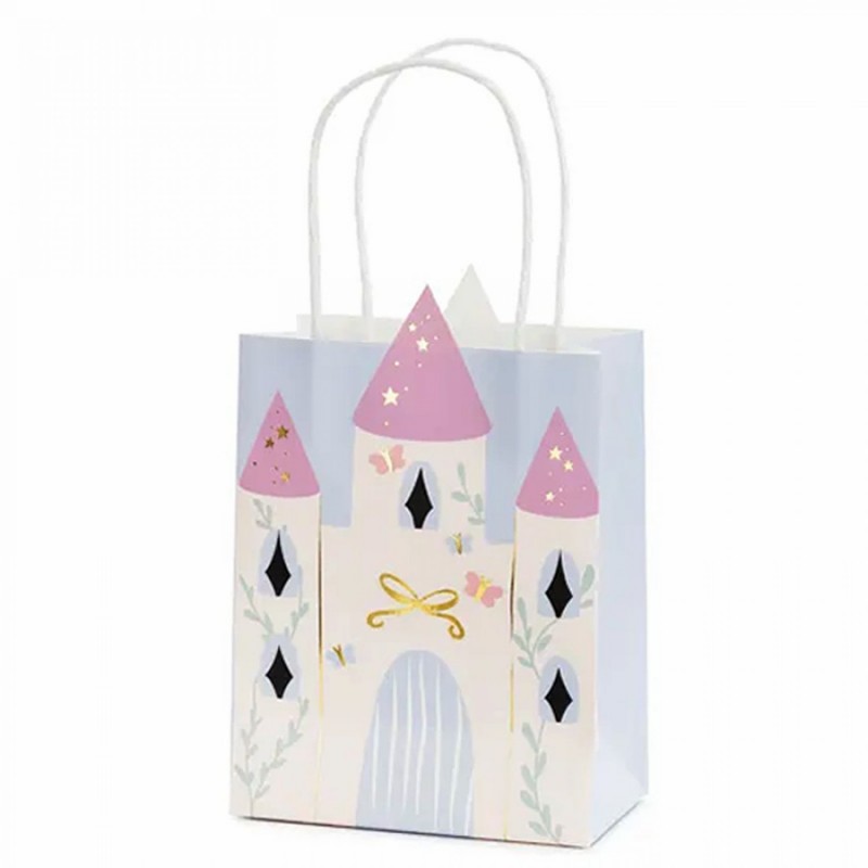 Saco de papel, para presente, pequeno, com desenho de castelo de princesa, em tons de nude, lilás, azul claro, verde eucalipto, rosa e dourado, com apontamentos de borboletas, folhagens, laços e estrelas douradas. Tamanho: 14cm x 8cm x 20cm