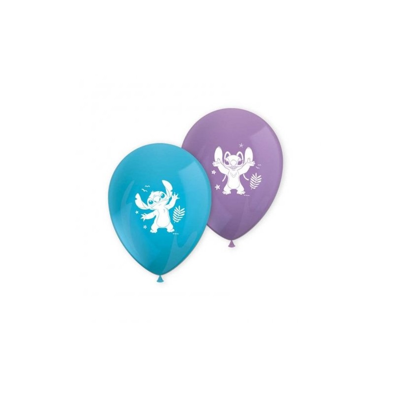 Embalagem com 8 balões de látex sortidos: azuis com a impresão do Stitch e roxos com a impressão da Angel.