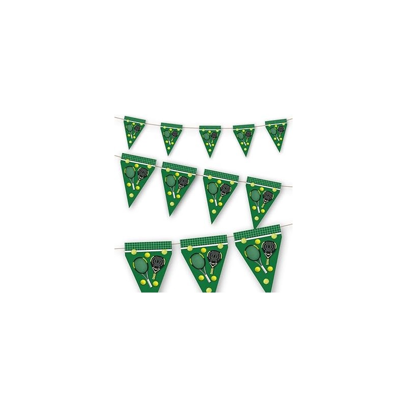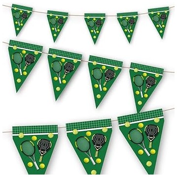 Embalagem com bandeira trinagular, de papel com raquetes e bolas de ténis e padel, com fundo relvado e rede em cima. Tamanho: 3m