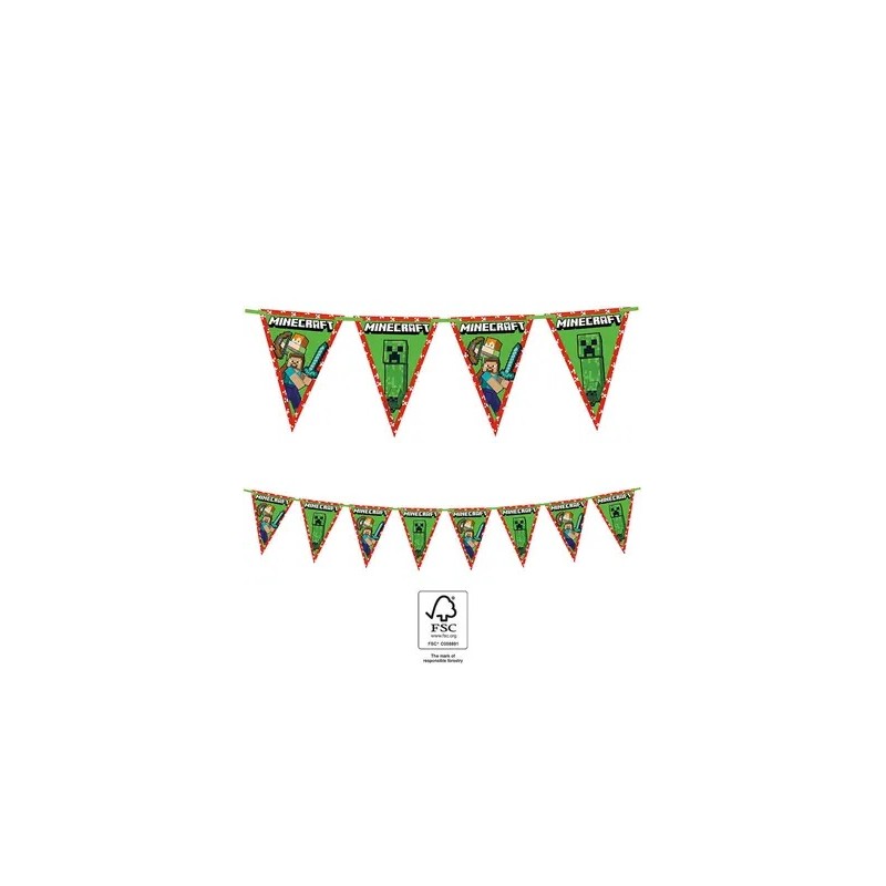Bandeirola triangular em papel do tema "Minecraft". A bandeirola é composta por duas bandeiras diferentes e colocadas alternadamente. As bandeiras são em verde com um rebordo em vermelho. Em todas surge a expressão "Minecraft". Numa é visível o boneco princial do tema. Na outra estão duas personagens com uma espada e com um arco. Aproximadamente 2.3m