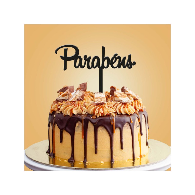 Topo de bolo em preto com a mensagem "Parabéns". Medidas 5mm x205mm x 130mm