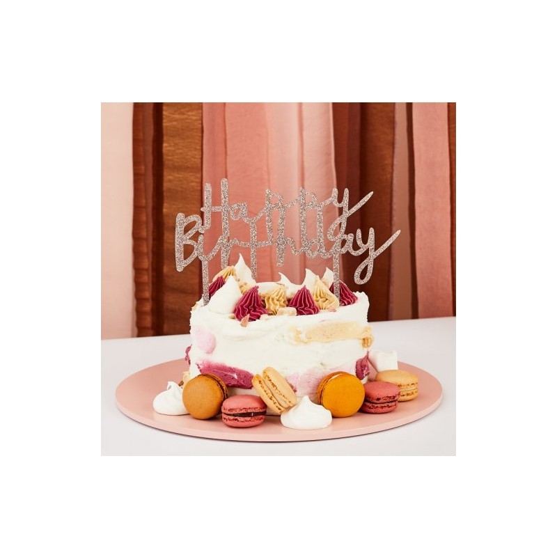 Topo de bolo, em acrílico, c/ lettering "Happy Birthday" adornado com purpurinas rose gold.