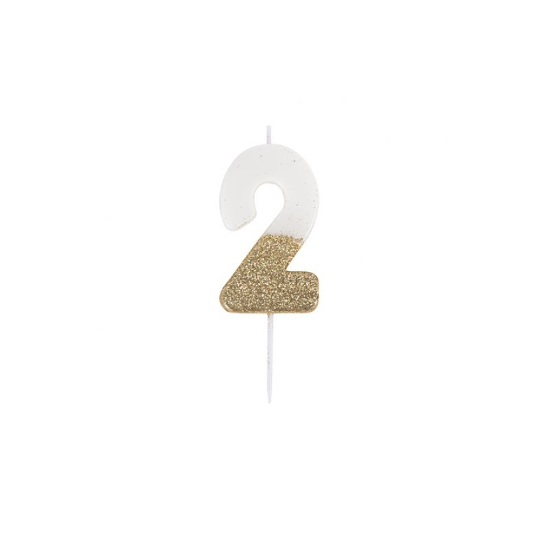 Vela de aniversário n.º 2 em branco e dourado com glitter. Aproximadamente 7cm.