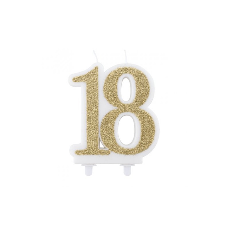 Vela de aniversário no formato dos números 18, com rebordo branco e fundo com glitter dourado. Tamanho: 12cm